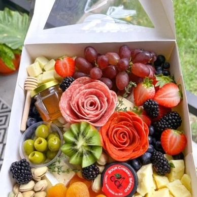 Our medium box is perfect for up to 4! It includes a variety of artisanal cheeses, cured meats, fresh seasonal produce, jam/honey, nuts, and delicious accompaniments. Crackers are included on the side.