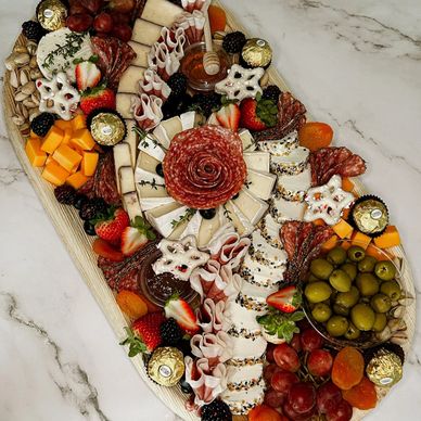 Our XL board is perfect for larger parties! It includes a variety of artisanal cheeses, cured meats, fresh seasonal produce, jam/honey, nuts, and delicious accompaniments. Crackers are included on the side.